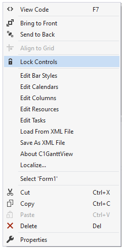 To access C1GanttView's context menu, right-click on the GanttView control and context menu: