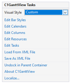 The C1GanttView Tasks Menu provides the most commonly used properties to assist you with your programming tasks. It also allows you to open the different editors available such as Columns Editor, Task Editor, and so on.