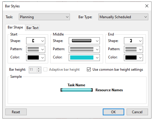 The Bar Styles dialog box is used for creating unique styles for the different types of task bars such as Auto Scheduled, Manually Scheduled, Progress Bar, Summary, Milestone, Deadline, Duration Only, and others. After specifying the Bar Type, you can easily modify its Shape, Pattern, Color, Height and Text.