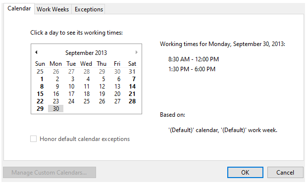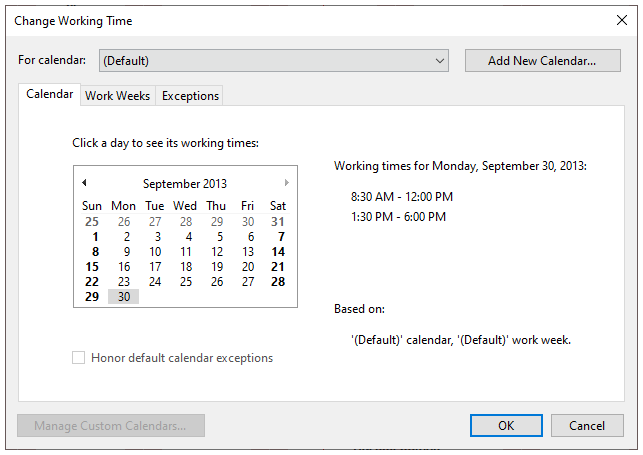 - Once you are finished with changing the working time in your schedule click OK to apply your changes to your calendar and close the Change Working Time dialog box.