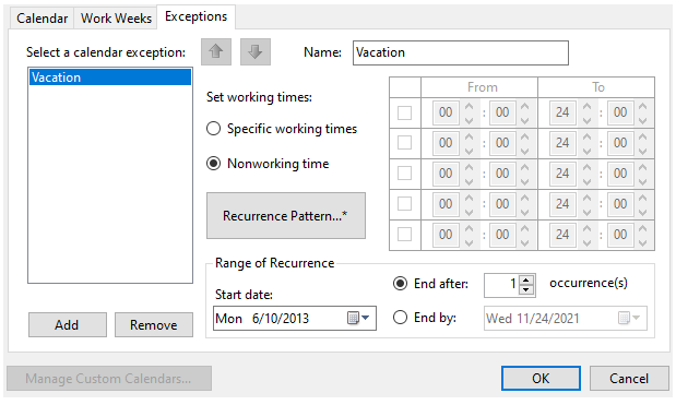- In the Exceptions tab, click the Add button to add a calendar exception.