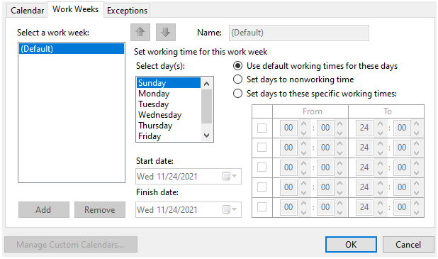 - Set days to nonworking time: Choose the days on which no work can be scheduled.