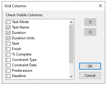 The Grid Columns dialog box lets you specify the attribute names you want to appear in the columns of the GanttView control. The default visible columns are Task Mode and Task Name, but you can change this default behavior by selecting the required columns from the Check Visible Columns list box.