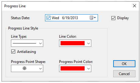 The Progress Line dialog box is used for displaying lines on the timescale. The progress lines draws attention to tasks that are ahead or behind the schedule.