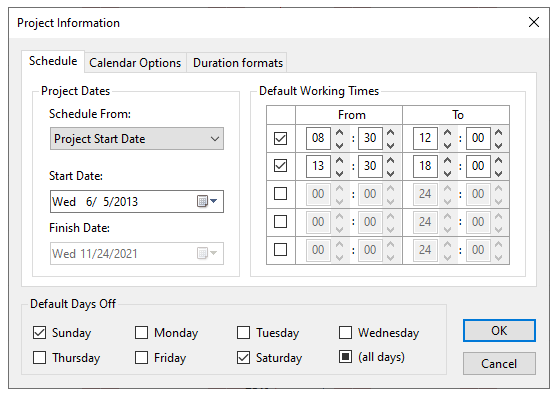 The Project Information dialog box is used for creating and scheduling a new project. The Project Information dialog box consists of a Schedule tab and a Calendar Options tab. The Schedule tab includes Project dates groupbox and a Default Working Times groupbox.