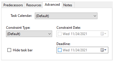 In the Advanced tab you can specify the task calendar, whether or not to hide the selected task bar, and specify a deadline for the selected task. If the task is auto scheduled, you can choose the constraint type and constraint date for the selected task.