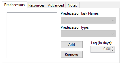 In the Predecessors tab you can add or remove predecessors, select the predecessor task name, select the predecessor type, and specify the lag time in days.