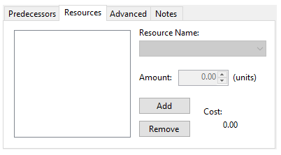 In the Resources tab you can add a resource to the selected task using the Add button or remove a resource from the selected task using the Remove button.