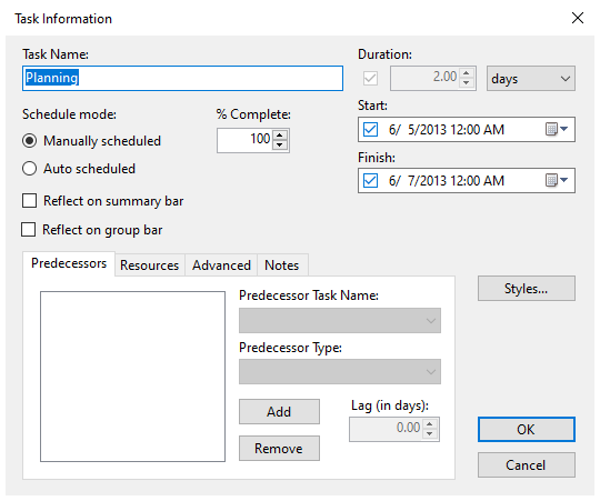 The Task Information dialog box is used for providing the details of the new task such as the task duration, task start date, task finish date, task schedule mode(manual or automatic), task percent completed, predecessor tasks, resource tasks, advanced tasks, and notes for the tasks.In addition to, you can also modify the style for each task by clicking on the Styles button.