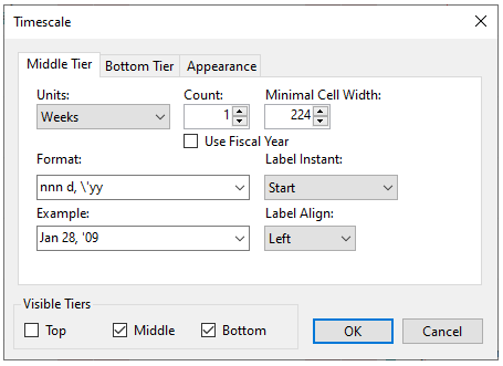 The Timescale dialog box is used for setting the minimum date/time and maximum date/time, specifying visible tiers, and customizing the appearance of the current day, nonworking time, and/or the project start/finish time at run time.