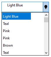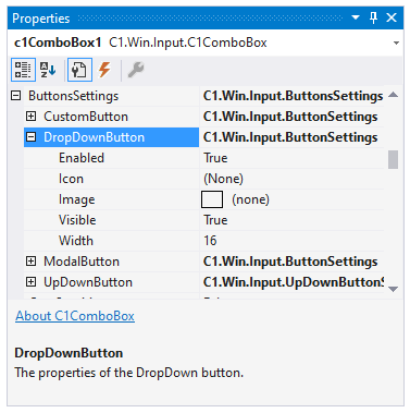 You can set an Custom button in a control by navigating to the ButtonSettings and CustomButton in the Properties window. You can add an image for the custom dropdown icon using the Image property. To make the custom button visible, set the Enabled and Visible properties to true.