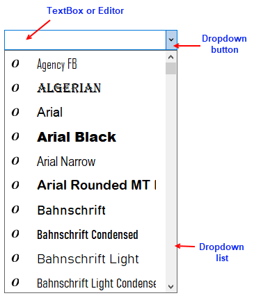 FontPicker comprises of three parts: textbox or editor, dropdown button and dropdown list.