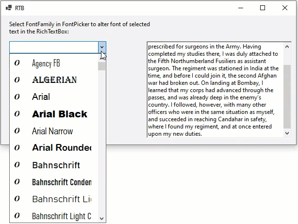 You can use FontPicker with controls like RichTextBox, such that the font of the selected text in RichTextBox gets altered as you pick any font in the FontPicker. For this purpose, the C1FontPicker class provides the SelectedFontFamilyChanged event, which fires when the SelectedFontFamily property changes.