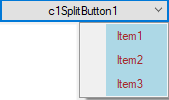 SplitButton enables you to customize the dropdown items by using ItemStyle property of the C1SplitButton class. The ItemStyle property lets you set the background color, foreground color, arrow color, and much more using BackColor, ForeColor, and ArrowColor properties of the DropDownItemStyle class. Besides these, it lets you apply styling on a particular state of the button like disabled and hot state.