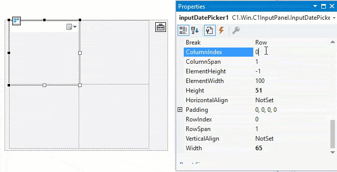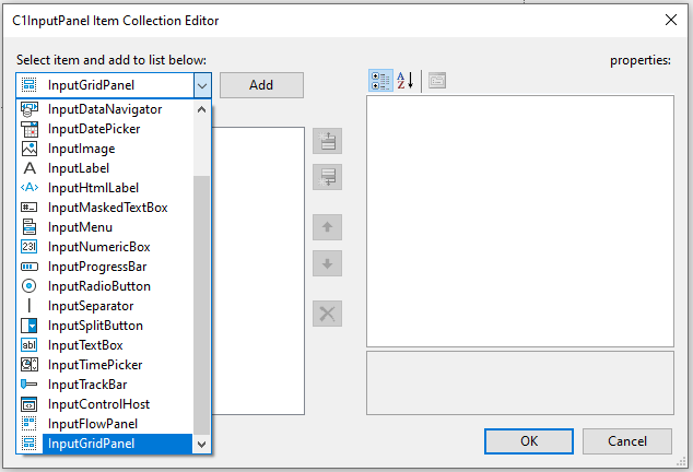 You can add the InputGridPanel layout to a Windows form by using the collection editor of C1InputPanel. The C1InputPanel Item Collection Editor can be launched by selecting the C1InputPanel on the Form and then clicking the ellipsis next to Items in the Properties window.