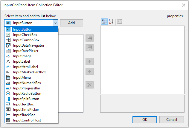 You can add, remove or edit items in the InputGridPanel layout by using the collection editor at design-time. The InputGridPanel Item Collection Editor can be launched by selecting the InputGridPanel layout on the Form and then clicking the ellipsis next to Items in the Properties window.