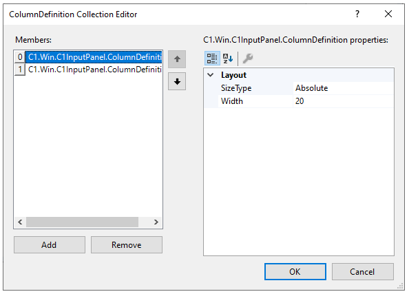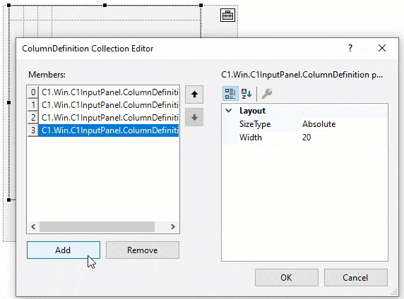 The ColumnDefinition Collection Editor opens when you click the ellipsis in the Properties window for ColumnDefinition.