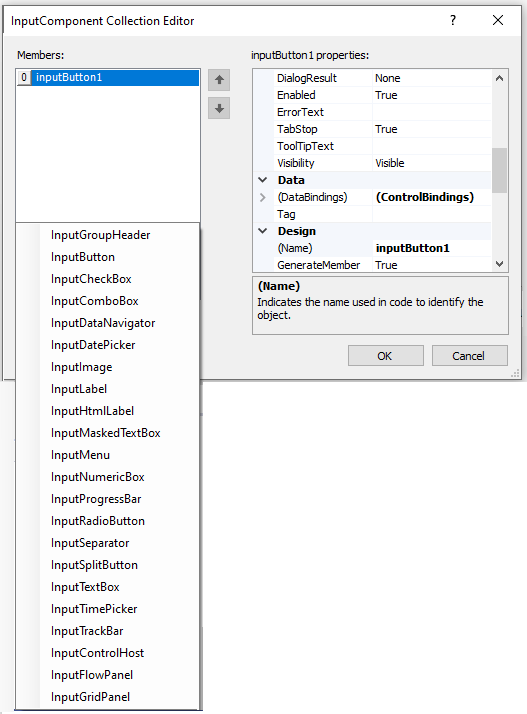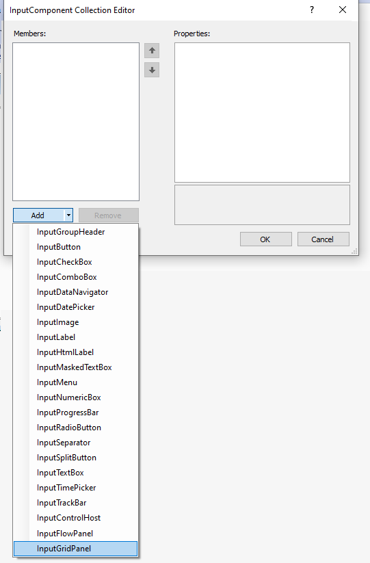You can add the InputGridPanel layout to a Windows form by using the collection editor of C1InputPanel. The InputComponent Collection Editor can be launched by selecting the C1InputPanel on the Form and then clicking the ellipsis next to Items in the Properties window.