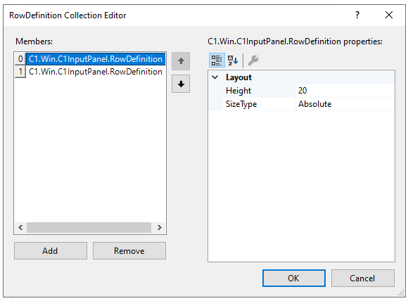 The RowDefinition Collection Editor opens when you click the ellipsis in the Properties window for RowDefinition.