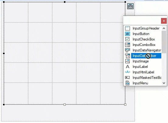 Note: Alternatively, you can also add InputGridPanel layout using the glyph feature in InputPanel designer, which when clicked opens a toolbox of components to be added to the panel.