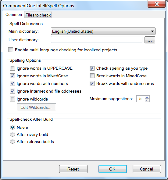 This option allows you to select the maximum number of suggestions to display for each misspelled word. Suggestions appear in context-sensitive menus and also in the ComponentOne IntelliSpell tool window.