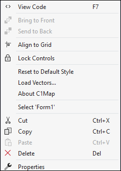 Map has additional commands with each context menu that Visual Studio provides for all .NET controls. To access Map's context menu, right-click on the Map control, and the context menu appears as follows: