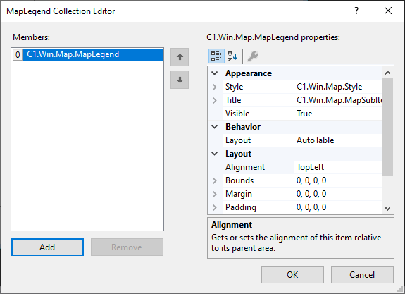 In the MapLegend Collection Editor window, the right pane displays properties like Style, Title, Visible, etc for each map legend. The left pane displays a list of legends along with Add and Remove buttons which can be used to add and remove legends, respectively.