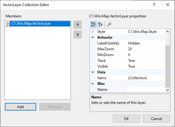 VectorLayer Collection Editor provides access to most of the vector layer's properties. It can be accessed by clicking on the ellipsis button (...) next to the Layers property in the Properties window.