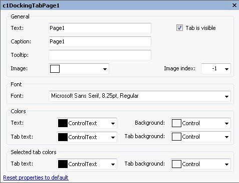 Reset properties to default | Selecting the Reset properties to default item resets the modified C1DockingTabPage properties back to their default values. |
