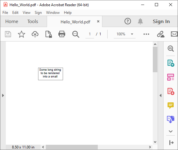 You can determine whether a string fits on the page well before rendering it using the MeasureString method. This method returns the SizeF structure, which provides the string's width and height (in points). This allows you to understand the space you would require to render the desired string in a PDF document. The MeasureString method can be useful in the scenarios where you would want to add a small amount of text into a PDF document and understand the space actually used by the text in the page.
