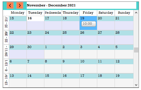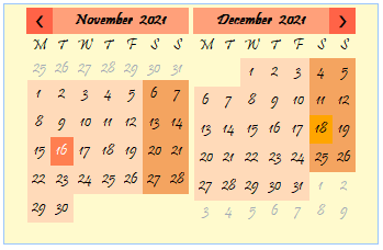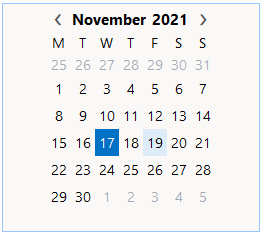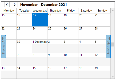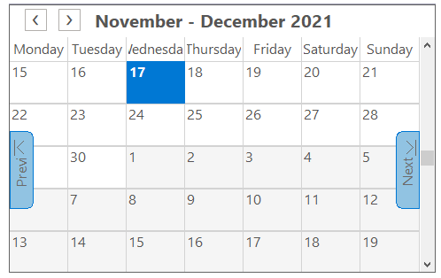 The following image depicts the Calendar control with the following properties modified using CalendarTheme in the Properties grid: