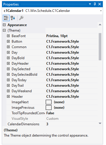 Also, in .Net 6, the Calendar control provides the CalendarTheme that can be edited from the property grid as depicted below: