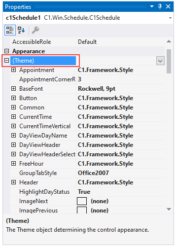 Also, in .Net 6, the Scheduler control provides the ScheduleTheme that can be edited from the property grid as depicted below: