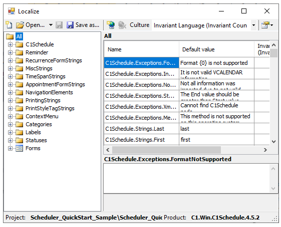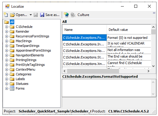The Localize dialog box allows you to localize the Scheduler for WinForms assembly (C1.Win.C1Schedule.2.dll) and save the localized resource in any project of your solution.