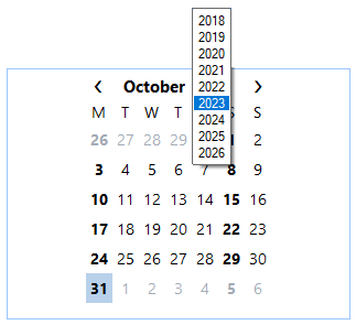 You can easily navigate through months or years in the calendar at run time. To do so, click once on the month popup selector as shown in the Calendar control's header.