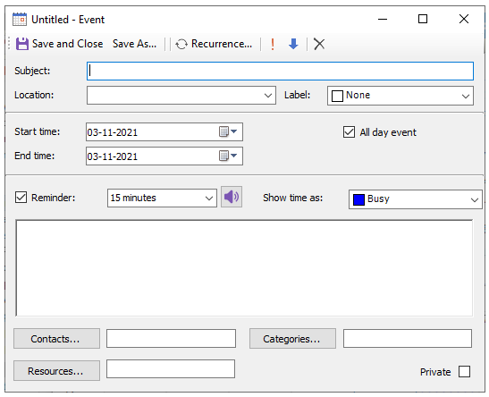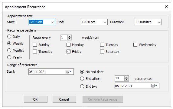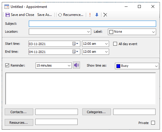 Clicking this item opens the Appointment dialog box which appears like the following: