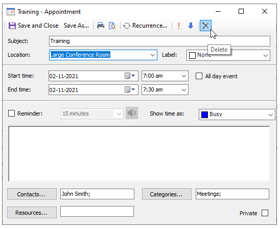 Appointments can also be removed through the Appointment dialog box. To remove an appointment through the Appointment dialog box, click the Delete button in the toolbar.