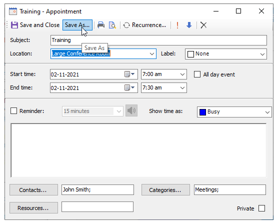 Selected appointments can be saved as binary (*.dat) files, iCal (*.ics) files, or XML files. To save an appointment in any of the file formats, either: