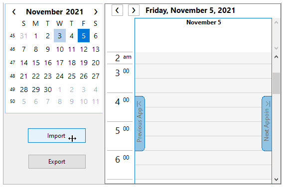 In the following example, C1Calendar and C1Schedule controls are added to the form along with two buttons named Import and Export. When the application is run, you'll be able to import and export data into the C1Schedule control.