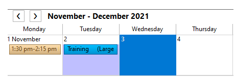 An appointment represents a period of time and detailed information about events that will take place during that period of time. Appointments can span from a specified duration, such as 30 minutes, to multi-day events, and can be set either in code or by binding to a data source, or at run time, either through the context menu or by clicking a specified time on the schedule.