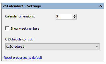 To hide the week numbers, locate the ShowWeekNumbers property in the C1Calendar Properties window and set it to False.