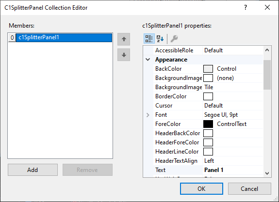 In the C1SplitterPanel Collection Editor window, the right pane displays properties like BackColor, Font, Text, etc for each panel. The left pane displays a list of splitter panels along with Add and Remove buttons which can be used to add and remove panels, respectively.