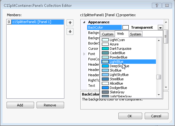 Click Panel 1’s BackColor drop-down arrow, select the Web tab, and choose LightBlue from the list and click OK to save and close the C1SplitContainer.Panels Collection Editor.