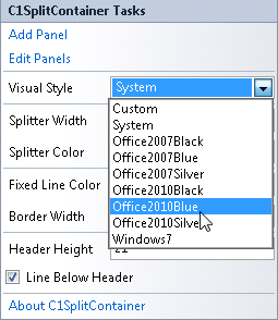 C1SplitContainer features eight embedded visual styles that you can apply to the control with just a few clicks. This topic illustrates how to change the control's visual style in Design view, Source view, and in code.