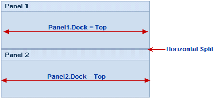 A horizontal split is the default split type for the C1SplitContainer. It divides the panels into two or more rows and is represented in the window’s page by one or more splitter bars. In a horizontal split the panels are both docked to the top.