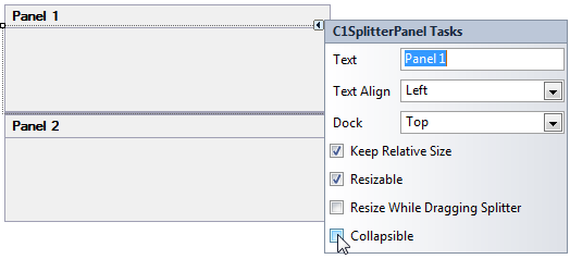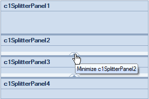 The panels in C1SplitContainer can easily be collapsed or expanded by setting the Collapsible property to True (see Adding a ToolTip to the Collapsed Splitter Panel). Once the property is set, you can click on the expander button to collapse or expand the panels.