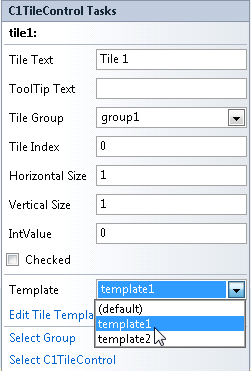 Once a template is created at design time through the C1TileControl.Templates Collection Editor or programatically through the TemplateCollection class it then can be assigned to a specified tile.