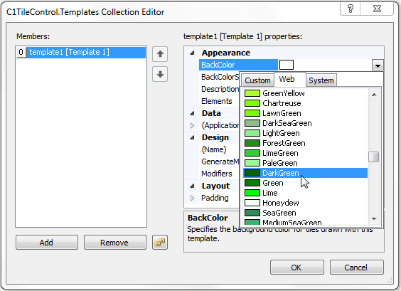 This will assign the DarkGreen backcolor to this template rather than the default backcolor. Once the Template is assigned to the specified Tile the new BackColor will appear.
