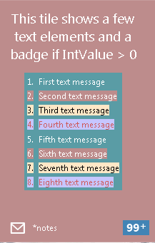 The following image displays a Tile with a few text element and a badge if IntValue is greater than zero.