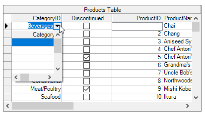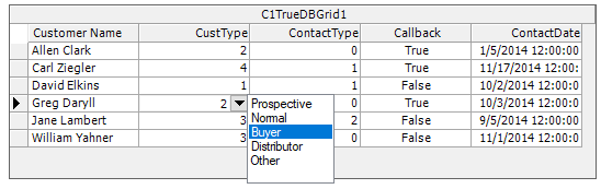 Normally, True DBGrid's default editing behavior is sufficient for most applications. In some cases, however, you may want to customize this behavior. One valuable technique is to use a drop-down list or combo box, or even another True DBGrid control, to allow selection from a list of possible values. This is easy to do with True DBGrid using virtually any Visual Studio or third-party control.